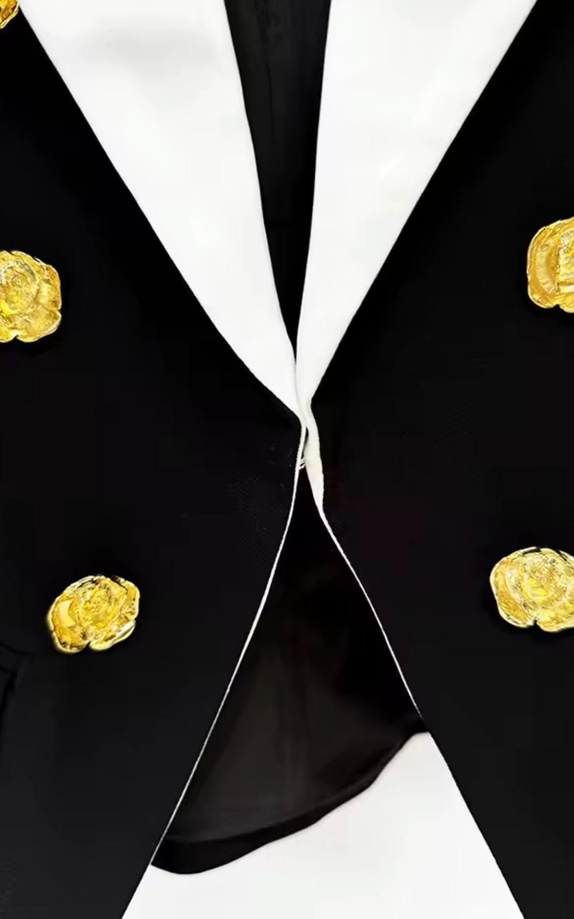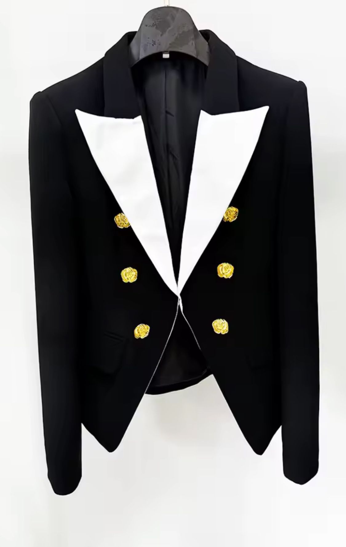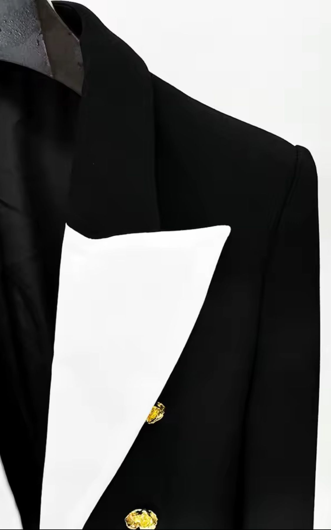 Americana entallada en negro con solapa blanca y botones metálicos dorados