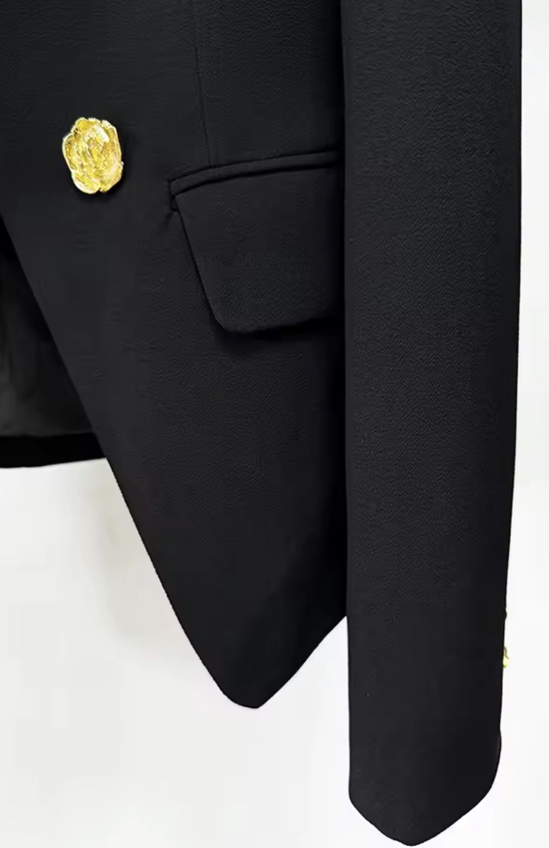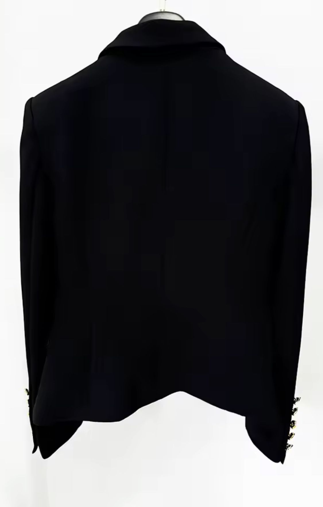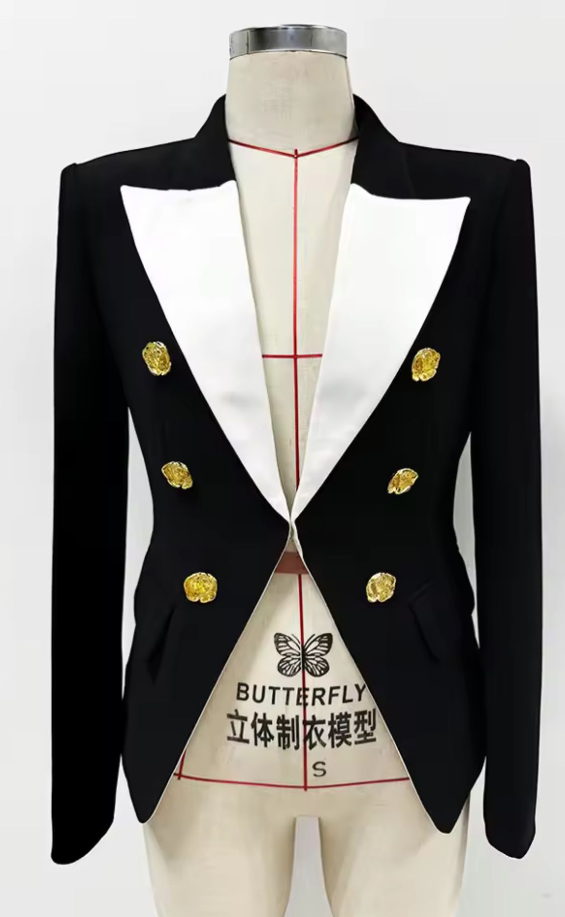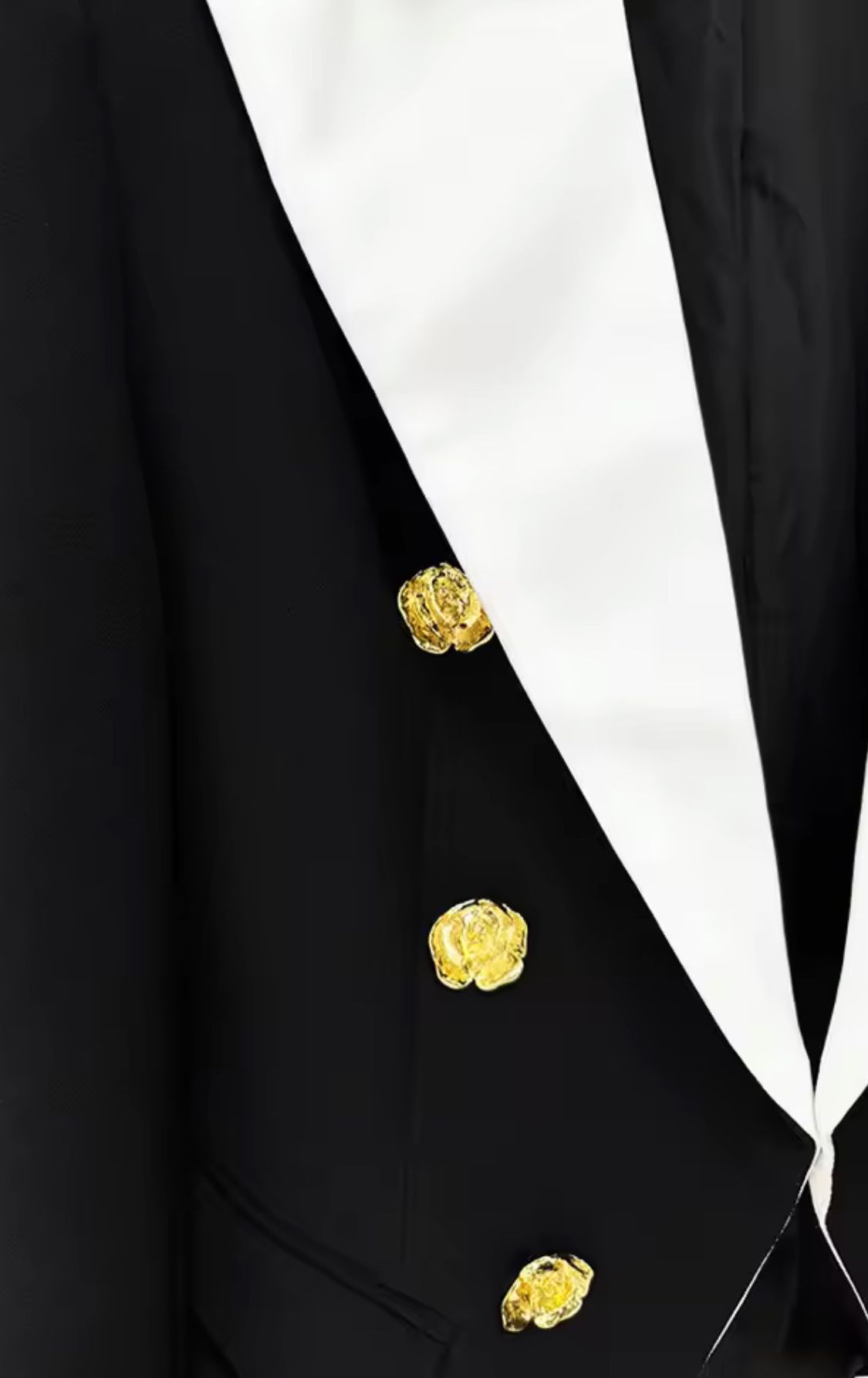 Americana entallada en negro con solapa blanca y botones metálicos dorados