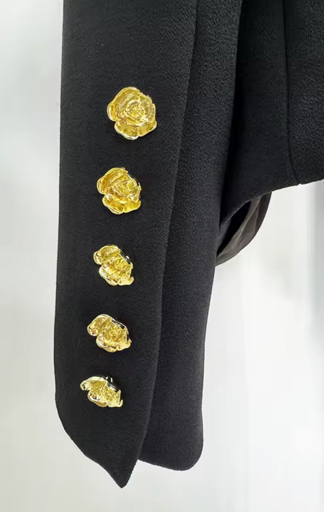 Espectaculares botones metálicos dorados en forma de flor.