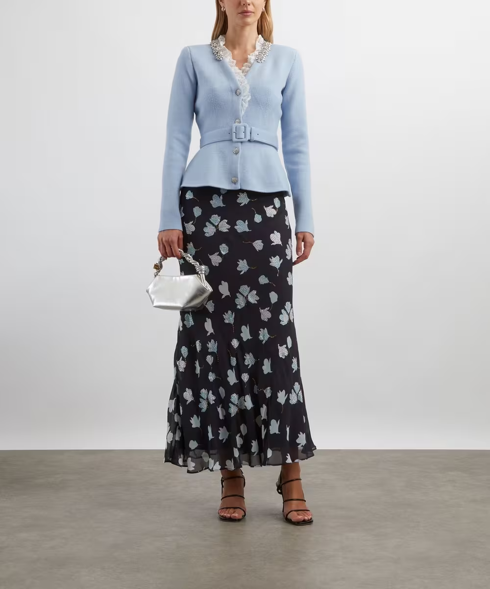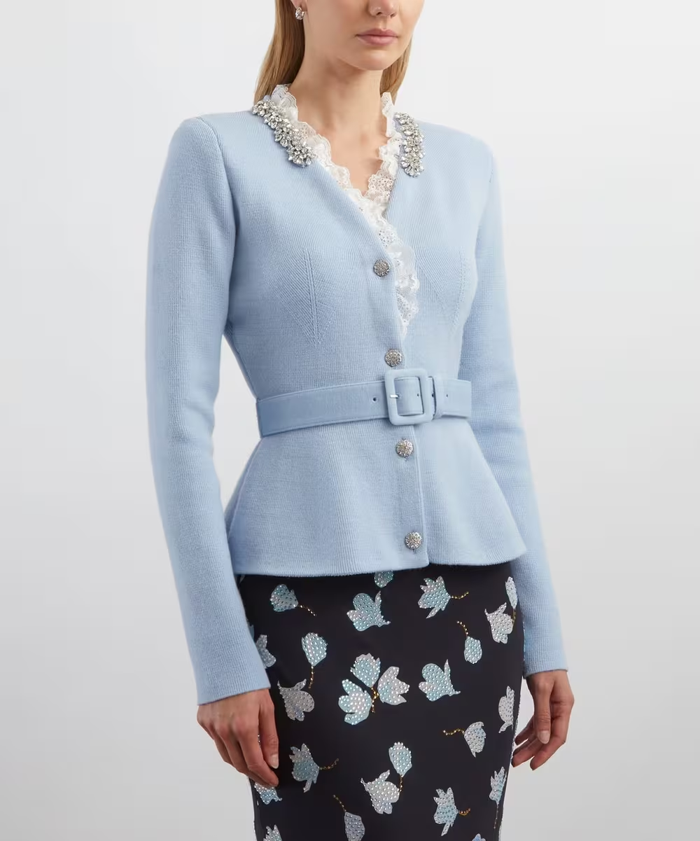 Se trata de un jersey chaqueta en azul cielo con una maravillosa pedrería de alta calidad.