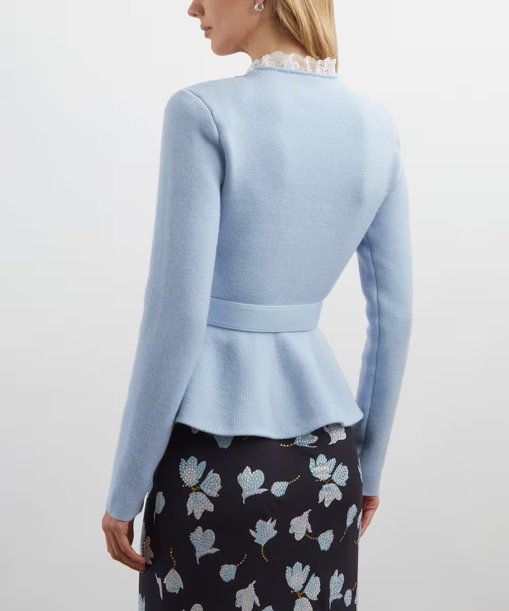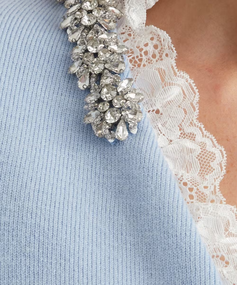 Cárdigan 100% lana en azul celeste con pedrería en cuello y botones con delicado encaje blanco decorativo