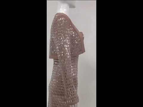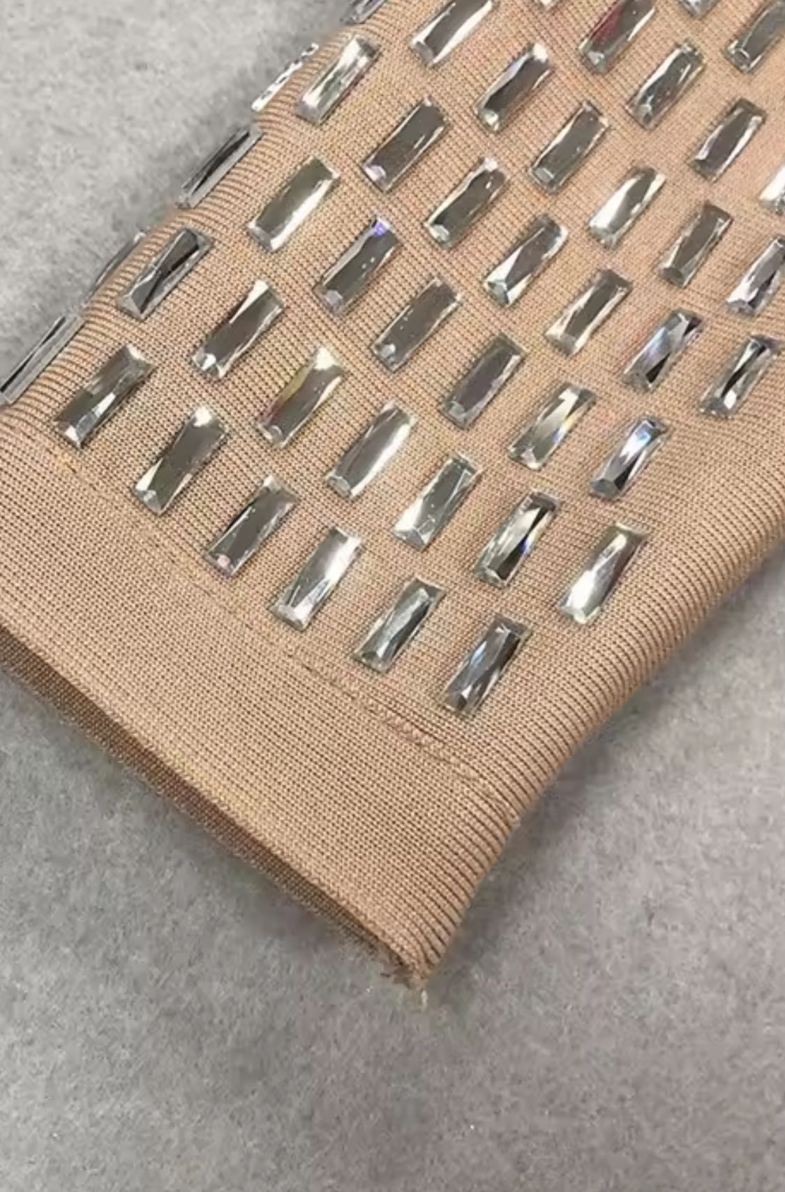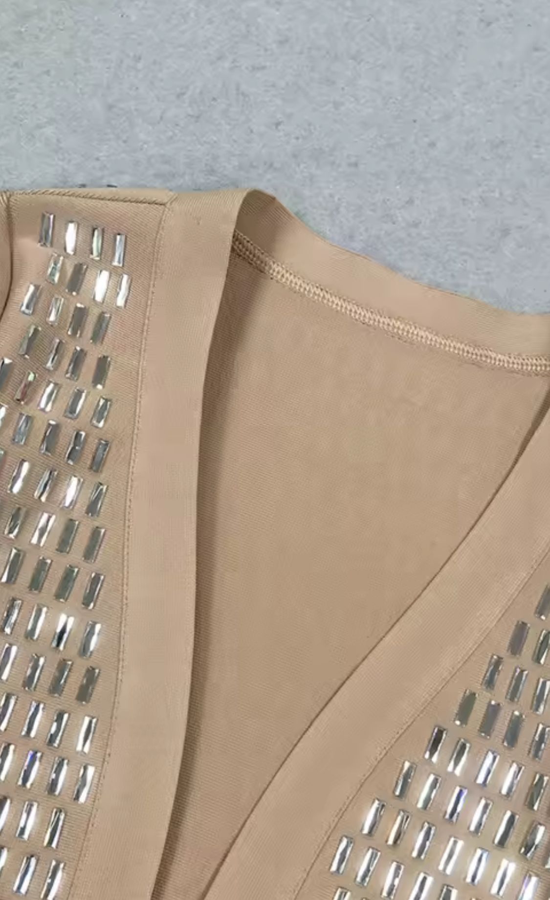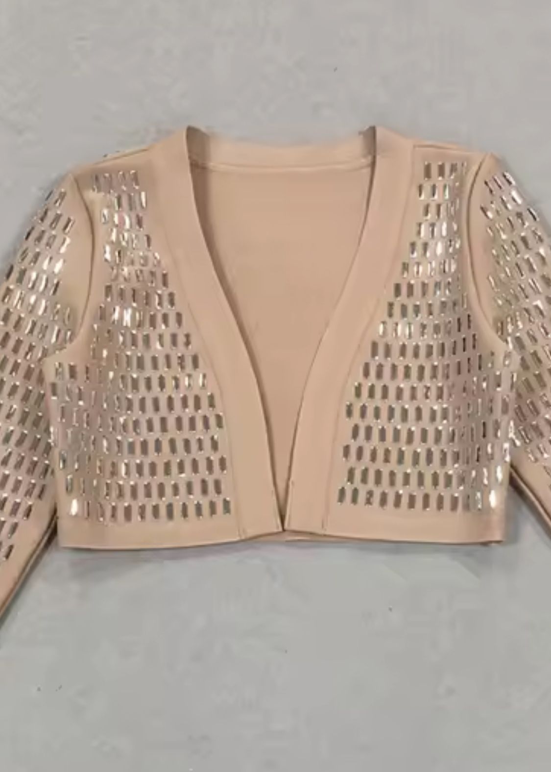 Chaqueta elástica de tejido bandage en color beige con pedrería plateada