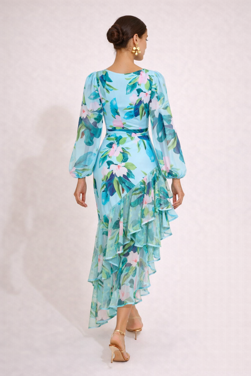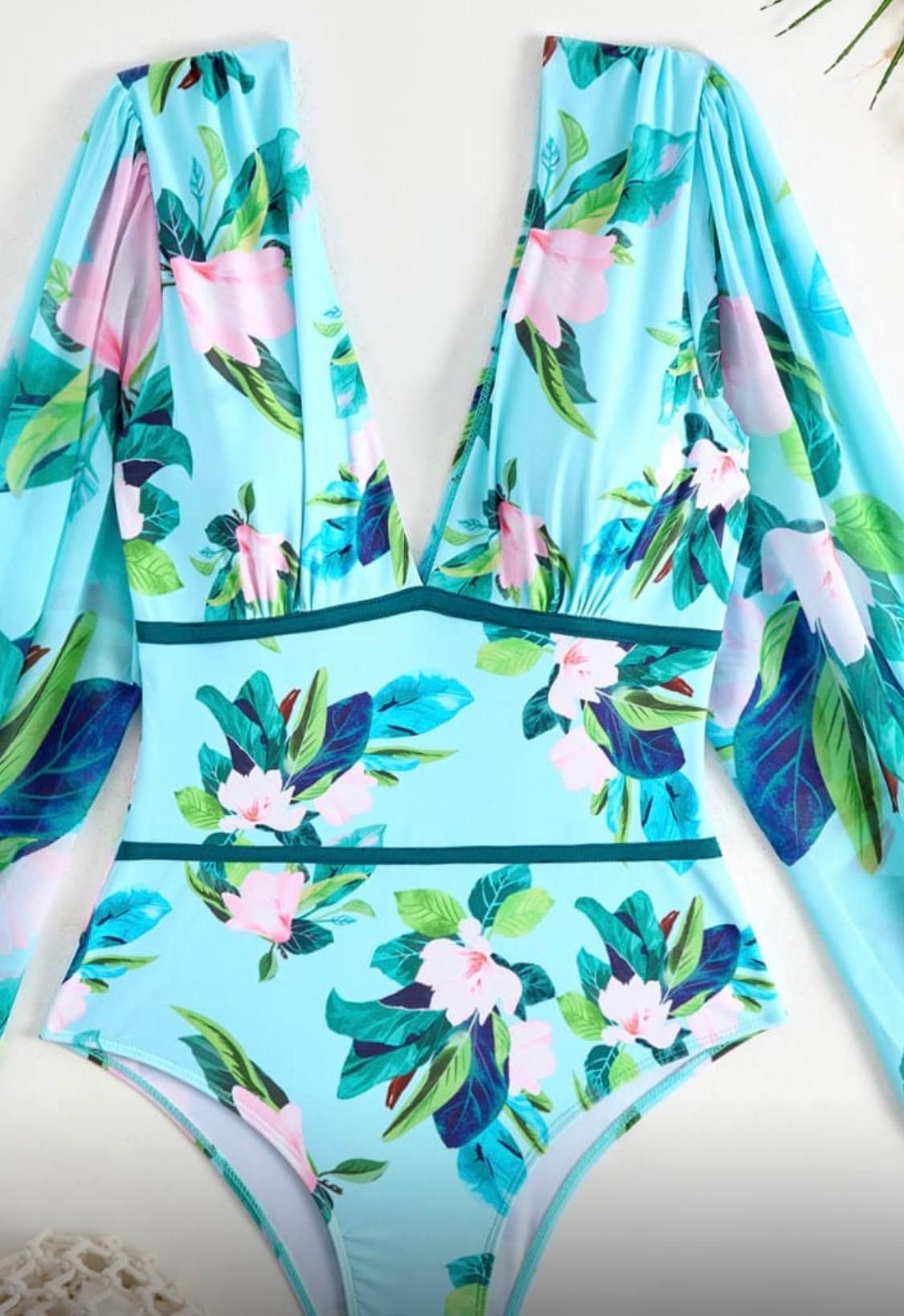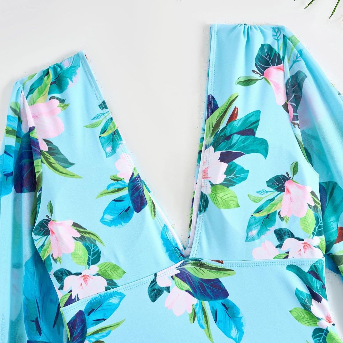Conjunto de dos piezas, body y falda a juego con estampado floral en tonos verdes y azules