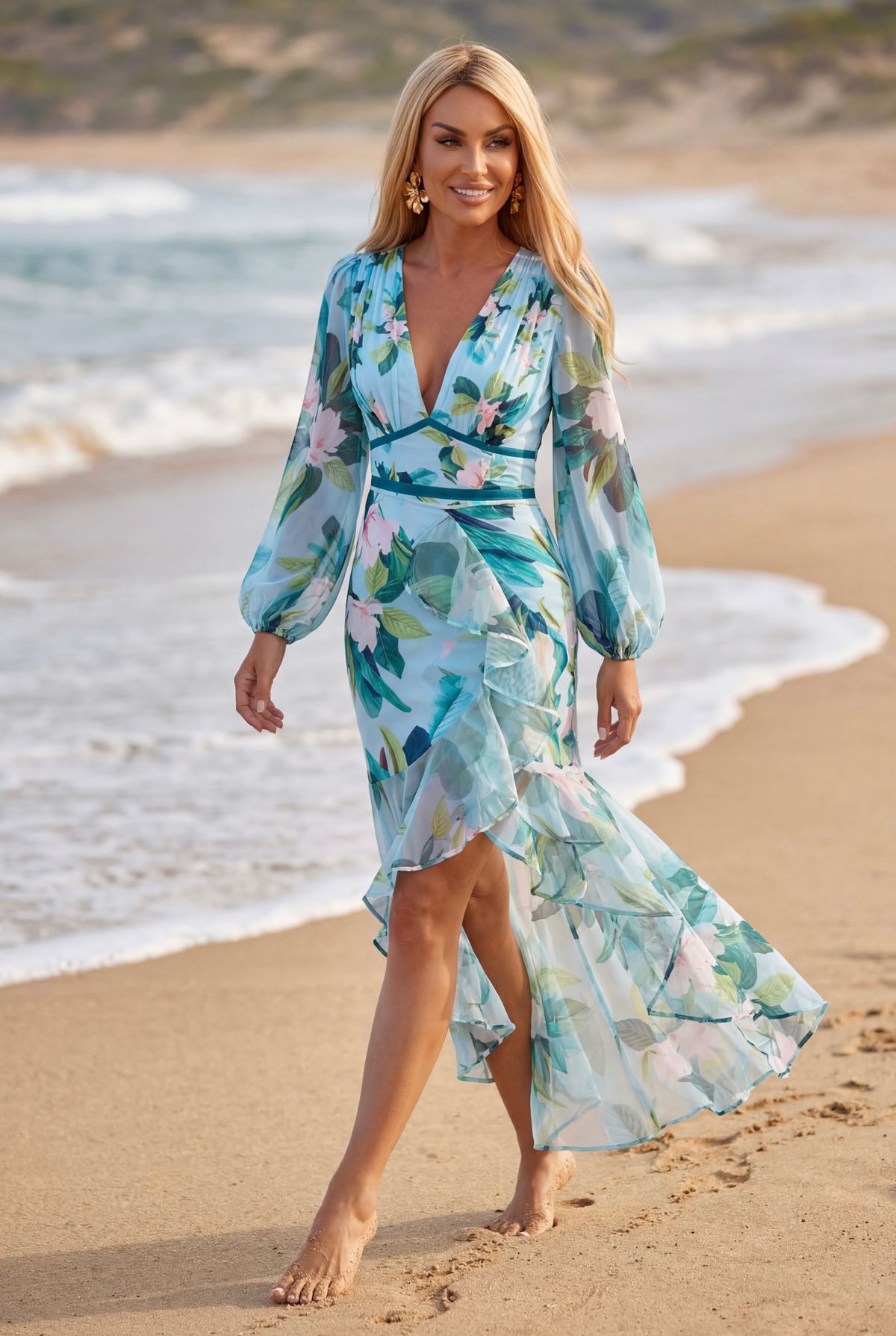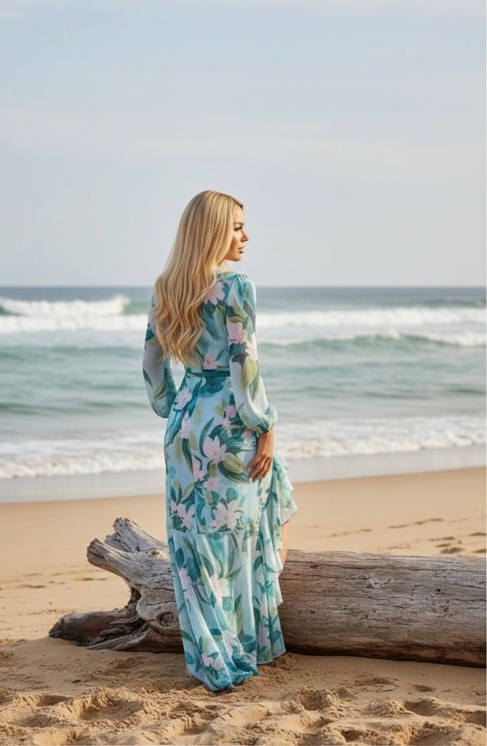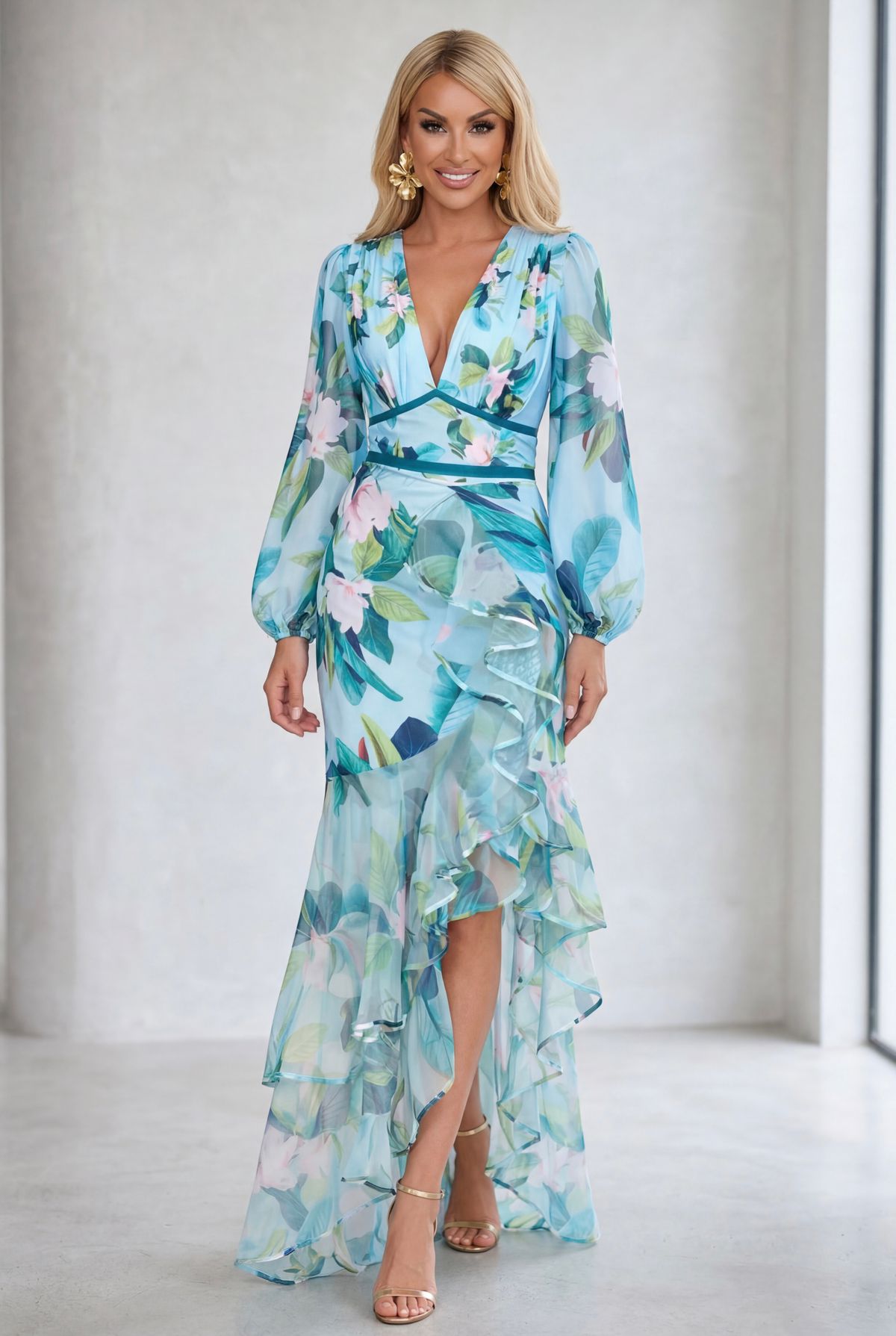 Conjunto de dos piezas, body y falda a juego con estampado floral en tonos verdes y azules