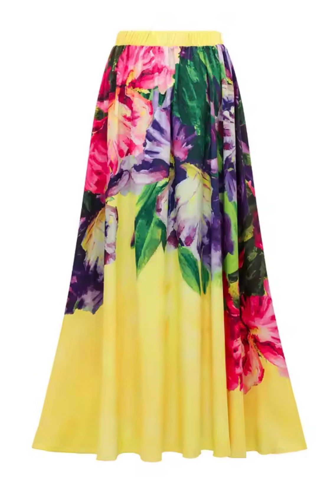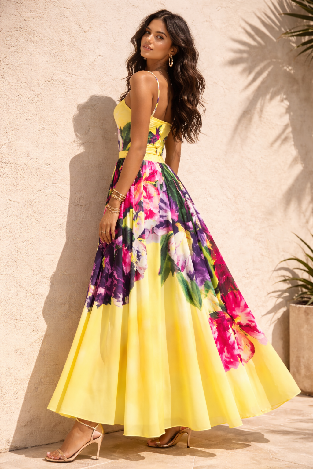 Conjunto elástico de body con tejido bañador y falda larga a juego en estampado floral amarillo.