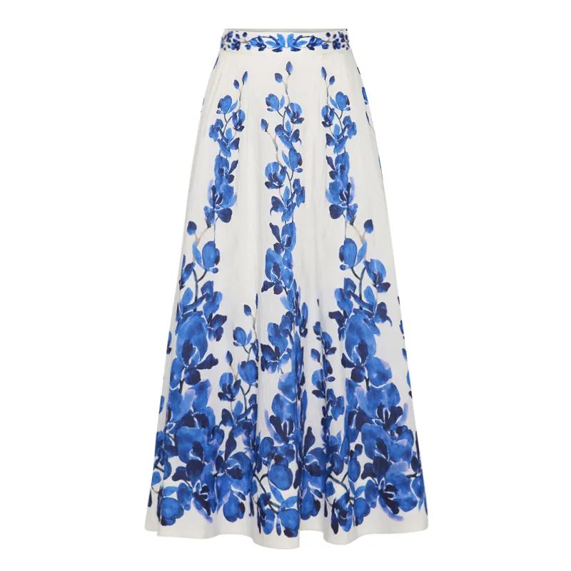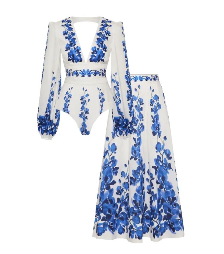 Conjunto de body tejido bañador de manga larga elástico con falda larga a juego. Con fondo blanco y preciosos detalles florales en color azul.