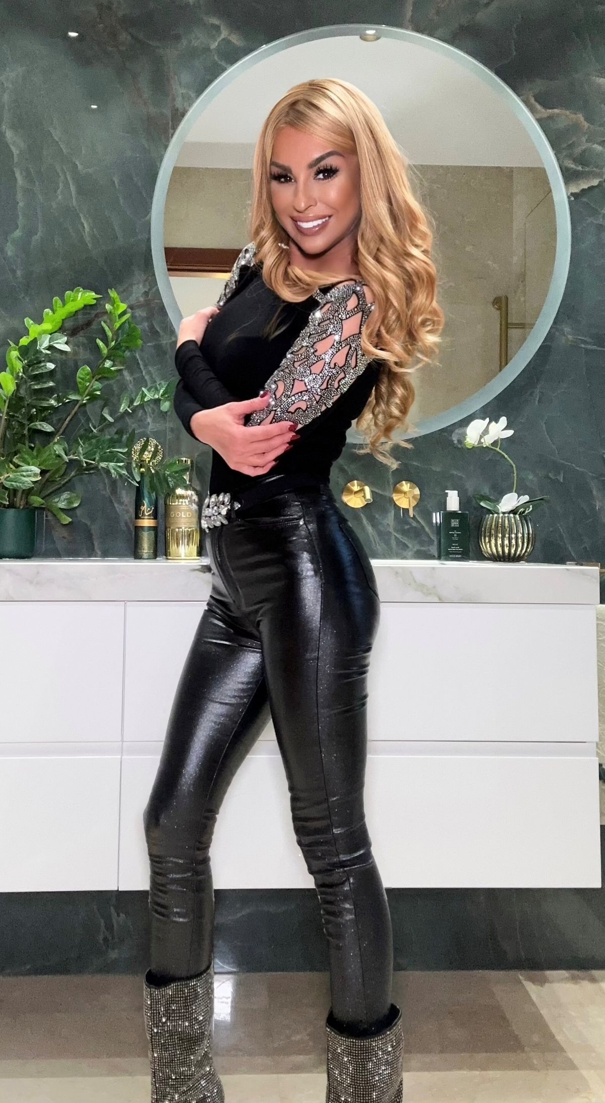 Jersey elástico de punto elástico negro de manga larga con pedrería en la zona de los hombros y brazos plateada