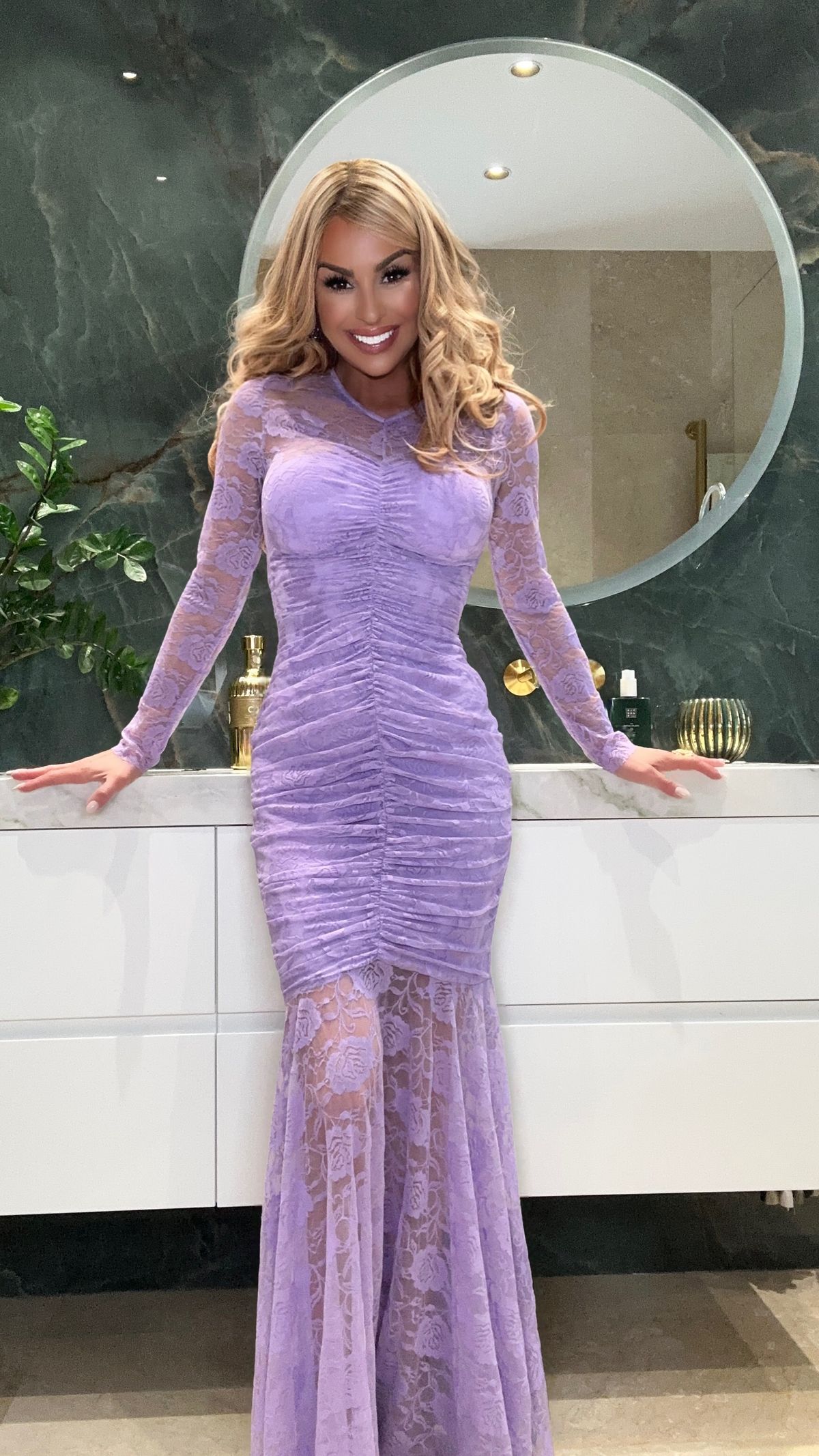 Vestido largo de encaje elástico de manga larga en color violeta. Se trata de un vestido súper favorecedor que marcará tus curvas de una manera elegante, sofisticada y cómoda.
